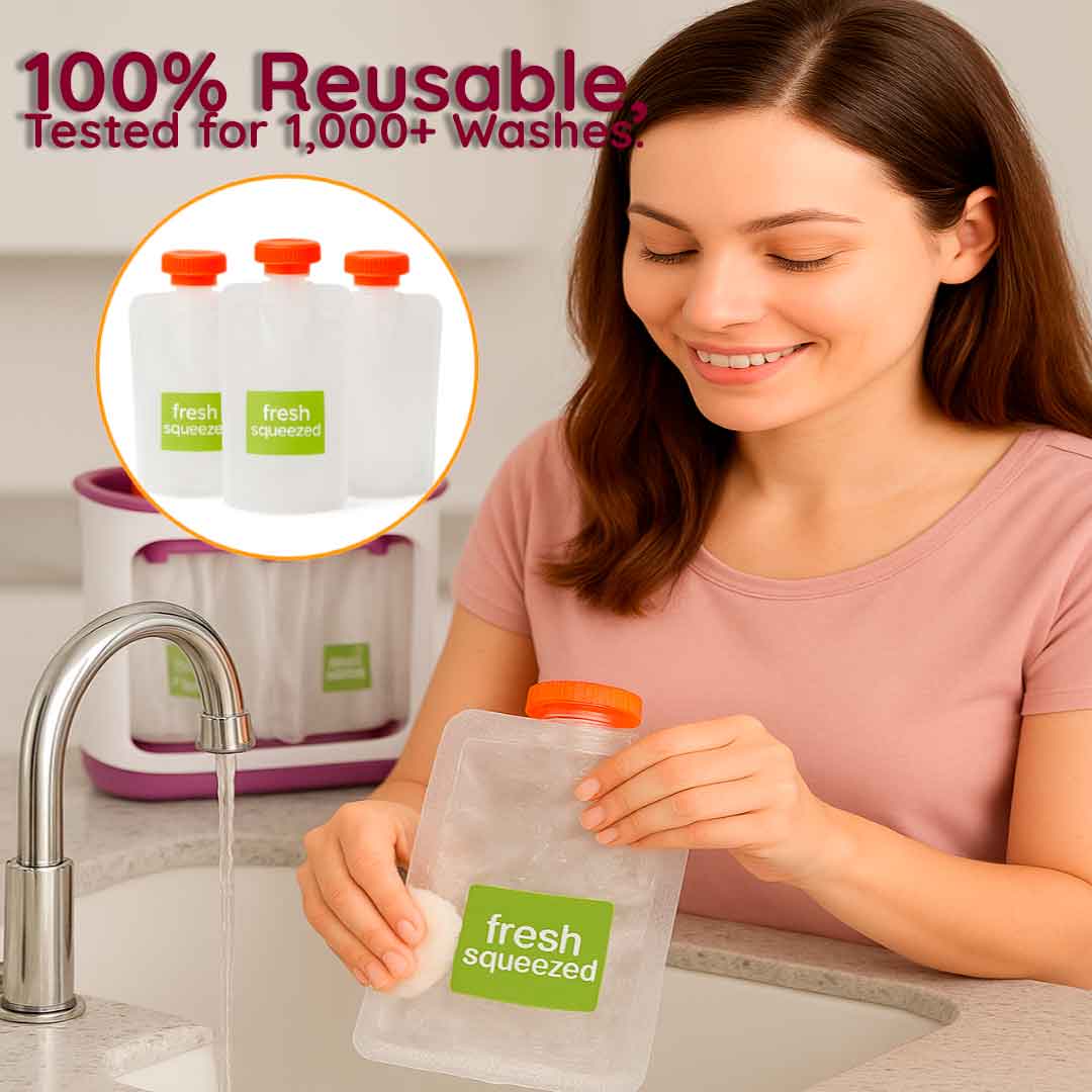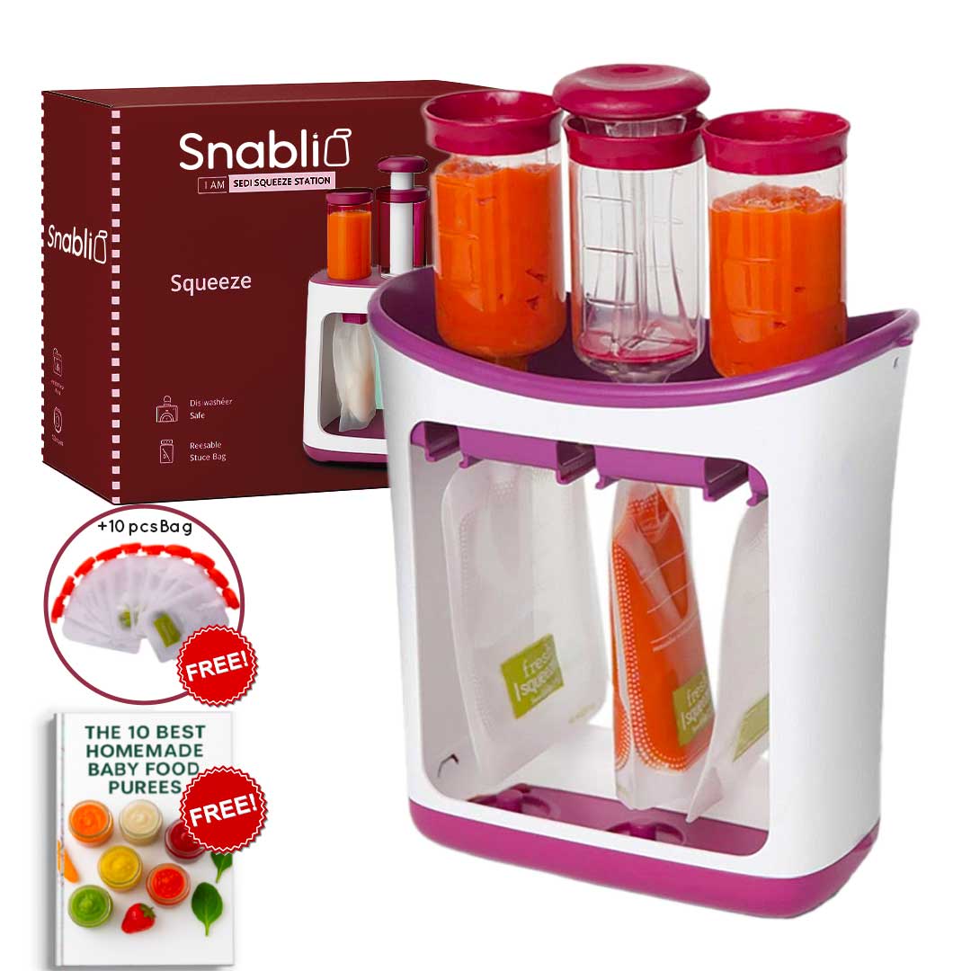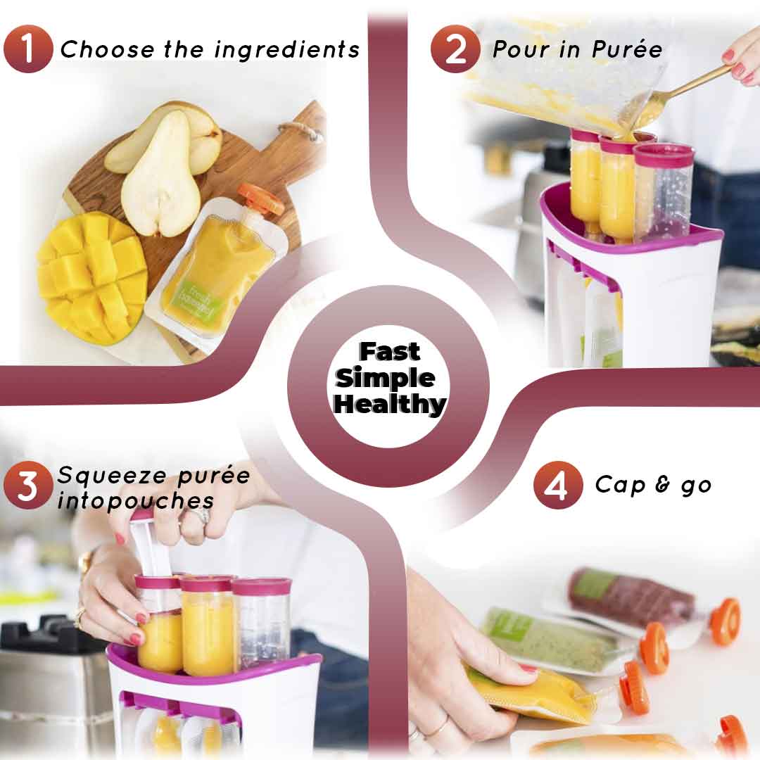 With our squeeze station, making homemade baby food has never been easier. Just choose your ingredients, pour in the purée, fill the reusable pouches, and seal to go 🍊