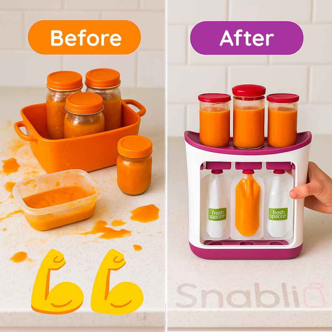 Before: Baby food everywhere, bulky jars, and a kitchen that’s hard to keep clean.